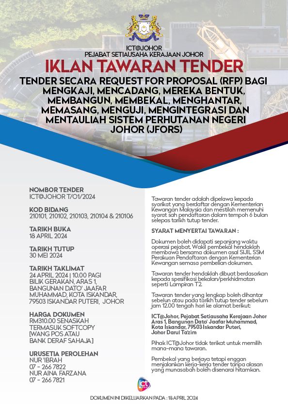 IKLAN TAWARAN TENDER : TENDER SECARA REQUEST FOR PROPOSAL (RFP) BAGI MENGKAJI, MENCADANG, MEREKABENTUK, MEMBANGUN, MEMBEKAL,MENGHANTAR,MEMASANG, MENGUJI, MENGINTEGRASI DAN MENTAULIAH SISTEM PERHUTANAN NEGERI JOHOR (JFORS)